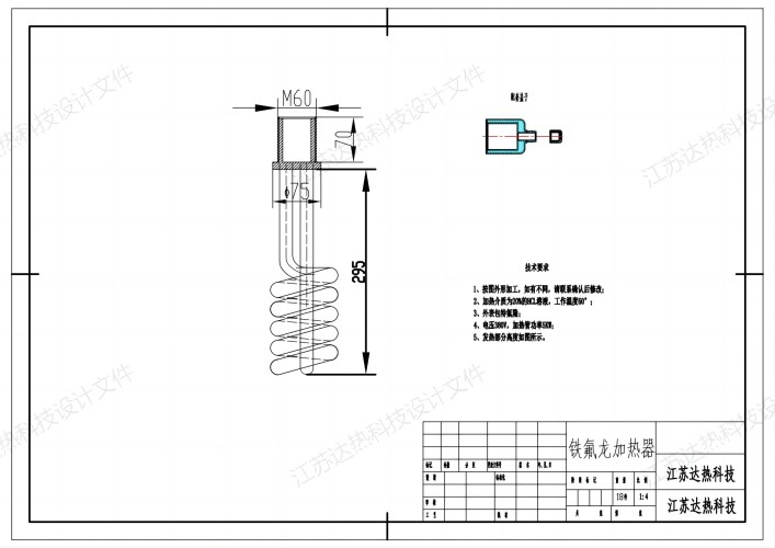 鐵氟龍加熱管是以耐腐蝕護套管作外殼或在普通加熱管的外層加四氟套管,緊固件如接觸到腐蝕性介質也需采用耐腐材料,接線端部可采用耐腐蝕橡塑合成材料模壓而成的電熱元件。