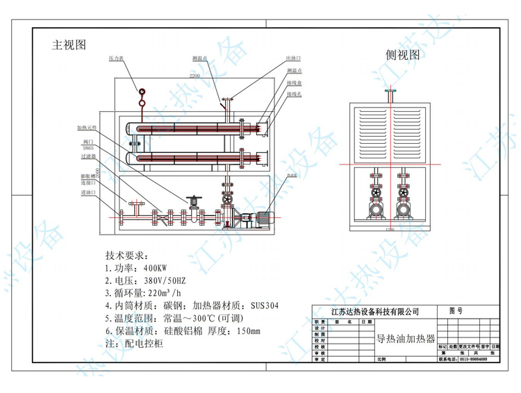 2、導(dǎo)熱油電加熱器具有完備的運(yùn)行控制和安全監(jiān)測裝置,可以準(zhǔn)確地控制工作溫度。